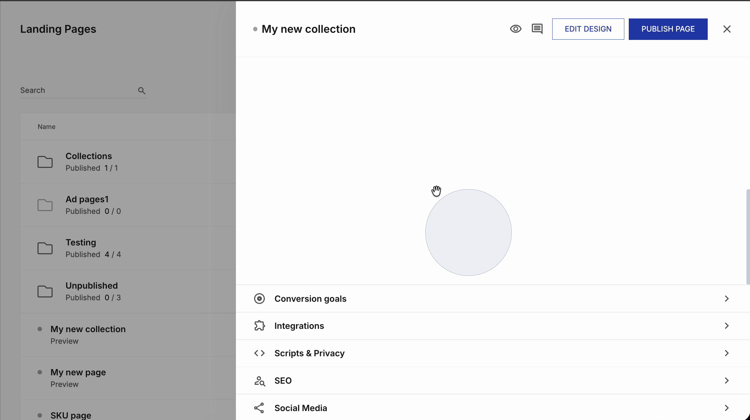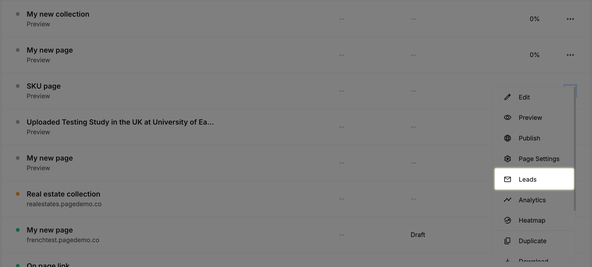 In the Landing Pages tab, click the three-dot menu next to the page name