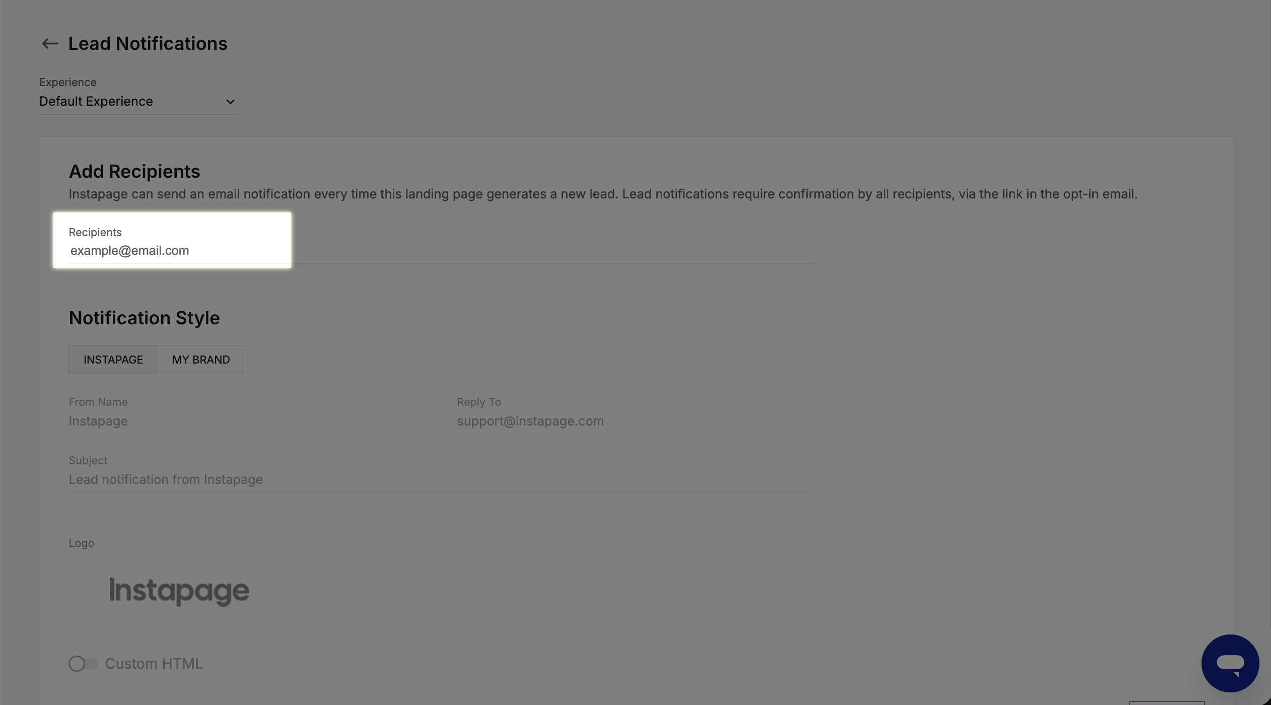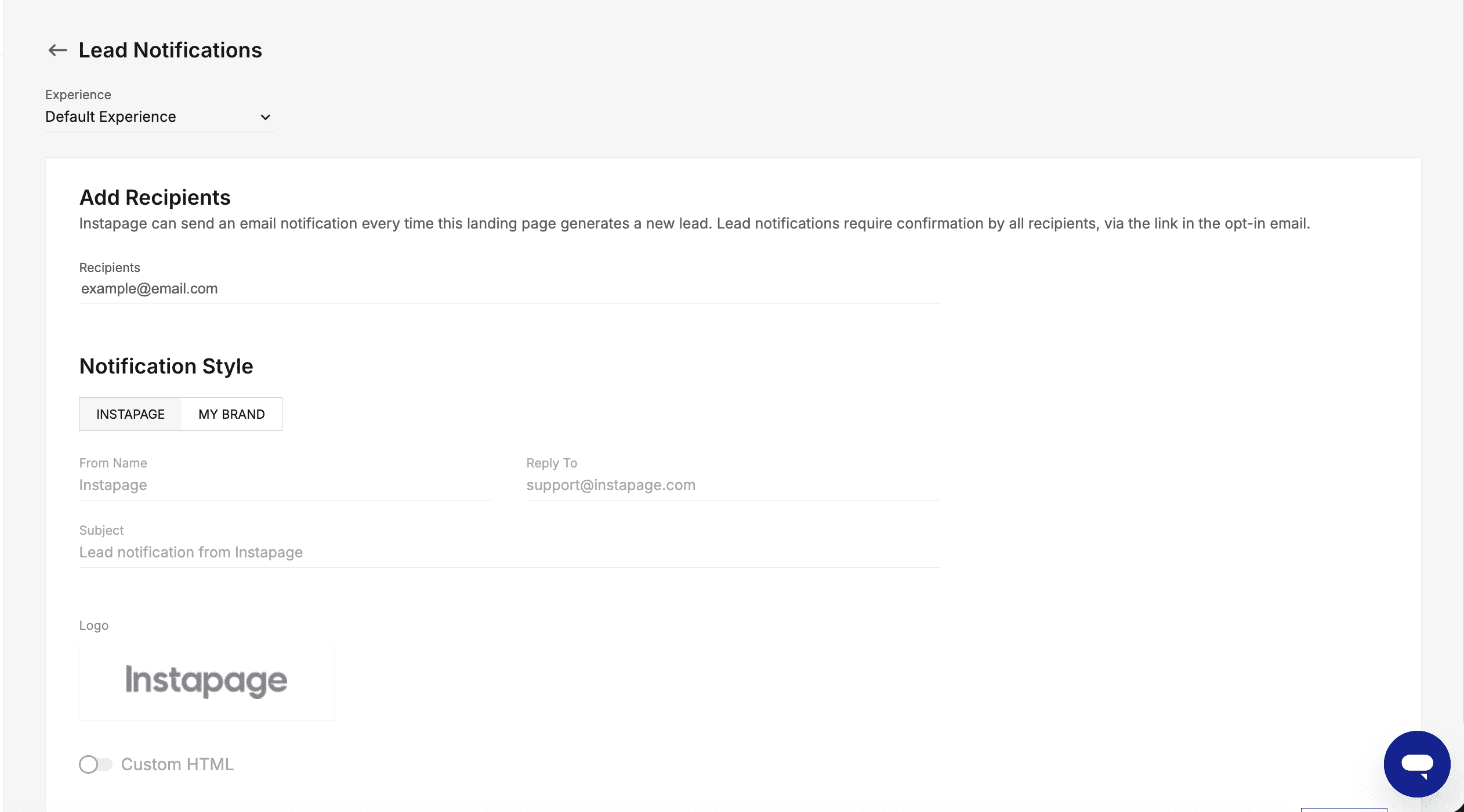 Please note that lead notifications are set up individually for each experience. They cannot be set in bulk for all the experiences of a page or for multiple pages at once.